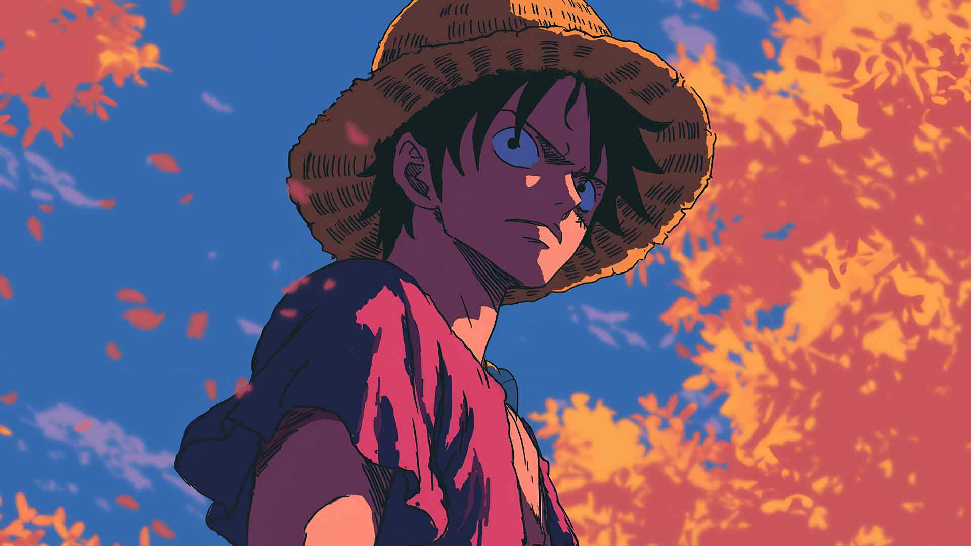 海贼王路飞秋叶日落桌面壁纸